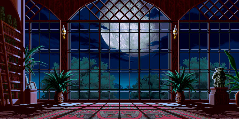 A pixelated blood splatter appeared in what appeared to be the mansion’s study. A desk sat in the middle of the room with a large bookshelf behind it. There was a painting of the hooded monks on the far left wall and beneath it a pedestal with a human skull sitting on top. Well that was one death down. Two to go.