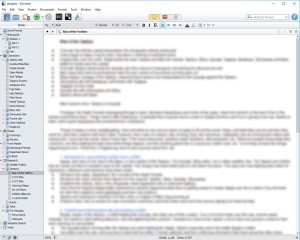 The format here in Scrivener is very similar to “The Deliverer”. This particular screenshot only has one window up but when planning it tends to have both so I can plan and refer to other things at the same time. I started by breaking the story down into slightly smaller chunks, the “seasons” if you want to think in TV terms. Then once I had a rough idea of what was happening each season with each clan I broke those down into smaller pieces. I think of these as like season arcs. Then once those were done I broke them down even smaller into episodes; the chapters. Chapters are based on whoever has the most important viewpoint necessary to move the plot forward at that particular time. I have a “Seasons” folder in the left there where every season has been at least roughly planned from start to finish. I know what’s happening to everybody and when. It’s such a huge story though that I’m still working on the specifics for later season arcs and chapters while I write the earlier stuff.
